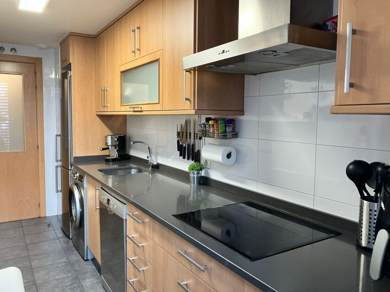 La urbanización cuenta con portero físico. La vivienda ubicada en una cuarta planta, se distribuye en hall de entrada, amplio salón comedor con aire acondicionado y salida a una estupenda terraza con vistas a las zona comunes pavimentadas de la urbanización que disponen de zona juegos para niños con un parque. Cocina independiente rectangular con salida también a la terraza previamente citada. Dormitorio principal con armarios empotrado, ventana y toma de TV. Baño compuesto por WC, lavado, bidet y bañera. Dos dormitorios de buen tamaño, ambos con armarios empotrados de puertas corredoras. Segundo baño compuesto por WC, lavado y plato de ducha con mampara. Garaje y trastero incluido en el precio.